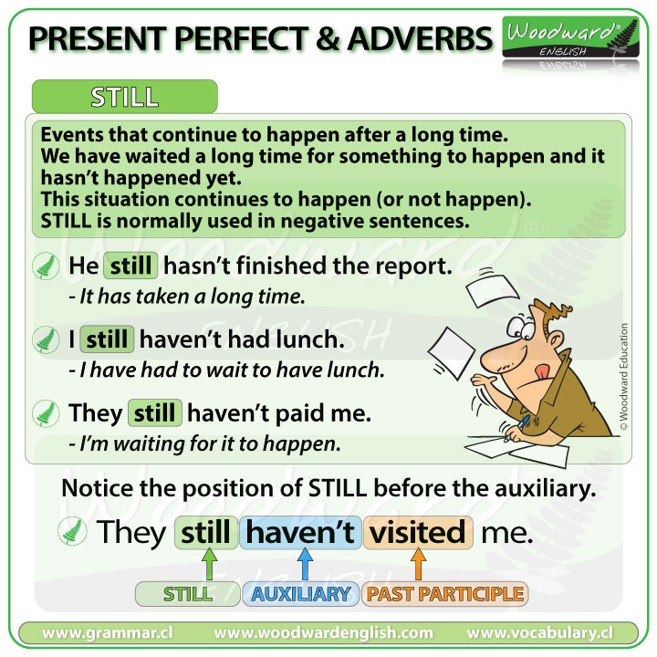 The adverb STILL can be used with the present perfect tense to express that we have waited a long time for something to happen or be done and it hasn’t happened yet. This situation continues to happen. When used in the present perfect tense, it is normally in negative sentences.