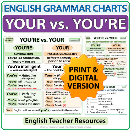 TWO English Grammar charts that help explain the difference between YOU’RE and YOUR in English.